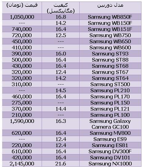 قیمت دوربین های "دیجیتال سامسونگ" به شرح جدول زیر است:
