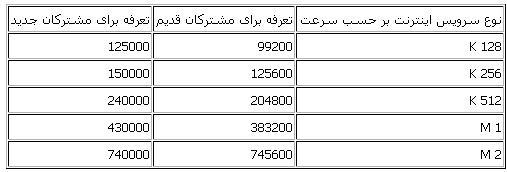بنابر این از مهر ماه تعرفه جدید خدمات اینترنت پر سرعت (برای مشترکان جدید) مطابق جدول ذیل خواهد بود. در این جدول تعرفههای فعلی (برای مشترکان قدیمی) و تعرفههای جدید (برای مشترکان جدید) نیز مقایسه شده است. (قیمتها به ریال است.)