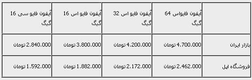 گفتنی است آیفون 5C نیز در حجم 16 گیگ در بازار تهران دو میلیون 840 هزار تومان تعیین شده که این گوشی نیز در اپل استور 549 دلار معادل 1 میلیون 592 هزار تومان است.