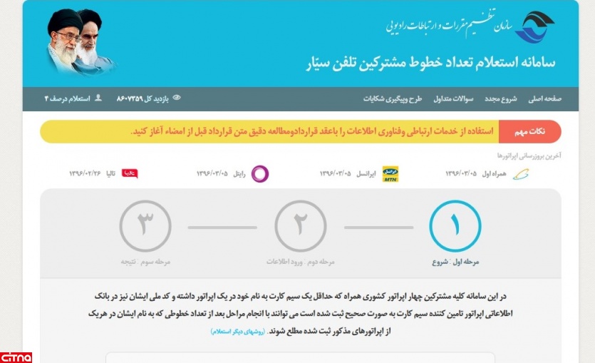 به گزارش سیتنا، بر اساس اطلاعات مندرج در سامانهی استعلام تعداد خطوط تلفن همراه، همه مشترکین اپراتورهای تلفن همراه که حداقل یک سیم کارت به نام خود در یک اپراتور داشته و کد ملی ایشان نیز در بانک اطلاعاتی اپراتور تامین کننده سیم کارت به صورت صحیح ثبت شده است می توانند با ورود در سامانه www.mobilecount.cra.ir و با انجام مراحل مشخص شده، از تعداد خطوطی که به نامشان در هر یک از اپراتورها ثبت شده مطلع شوند.
