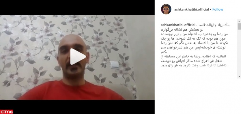 به گزارش سرویس وبگردی سیتنا، اشکان خطیبی فیلمی از رضا نظری کمدین خنداننده شو «خندوانه» را در اینستاگرام منتشر کرد و در توضیح آن نوشت: «آدمیزاد جایزالخطاست و بخشش هم نشانه بزرگواری. من رضا رو بخشیدم، اشتباه من و تیم نویسنده مون هم بوده که تک به تک شوخی ها رو چک نکردند تا من با اعتماد به نفس نگم که متن رضا نوشته خودشه. پس من هم عذرخواهی می کنم. اتفاقیه که افتاده...رضا به خاطر این مسابقه از شغلش اخراج شده.»