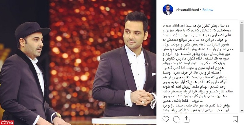 "ده سال پیش تیتراژ برنامه عید میساختیم که دعوتش کردیم که با فرزاد فرزین و علی اصحابی بخونه، آروم، متین و مؤدب اومد و خوند، در این ده سال هر موقع دیدمش به همون اندازه یک دهه پیش متین و مودب بود، حتی آخرین بار سه هفته پیش که اتفاقی دیدمش تو بیمارستان، روی ویلچر نشسته بود، آروم و خیره به یک نقطه، نگاه نگران مادرش کنارش و پدری که محکم و استوار ایستاده بود، بهنام همون اندازه متین و نجیب اما کمی کُندتر، آهستهتر و بیحال تر حرف میزد، وسط روزهایی که معلوم نیست طلب چی رو از هم دیگه داریم که آنقدر همدیگرُ آزار میدیم و بیرحم شدیم، بهنام فقط آرزوش اینه که بتونه سالم کنار همسر و فرزندِ تازه از راه رسیدش باشه، همین، حتی بدون کار، بدون شهرت، بدون ثروت، فقط باشه، همین ...