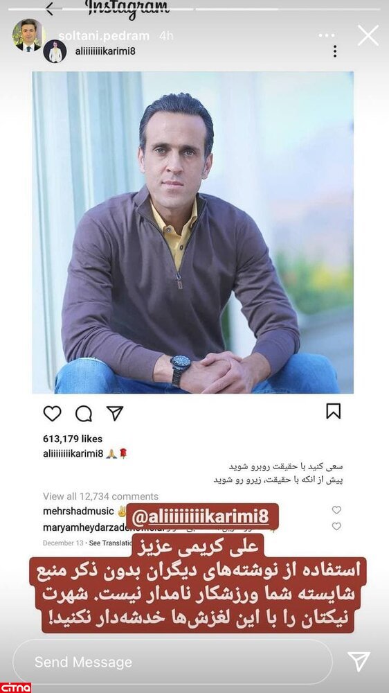 به گزارش سرویس وبگردی سیتنا، در سالهای اخیر ورزشکاران و پیشکسوتان ایرانی در فضای مجازی فعالیت زیادی دارند و بعضا در پستهای خود از متنهای مختلف استفاده میکنند اما از صاحب متن نامی نمیبرند. این موضوع واکنش پدارم سلطانی را به همراه داشته است و او با انتشار دو تصویر از صفحات فرهاد مجیدی و علی کریمی این موضوع را به این دو نفر تذکر داده است.