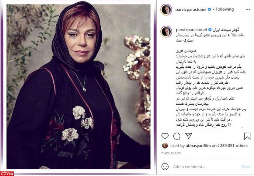 به گزارش سرویس وبگردی سیتنا، در همین ارتباط، پرویز پرستویی در صفحه شخصی اینستاگرامش، از تماس تلفنی با گوهر خیراندیش که به دلیل بیماری کرونا در بیمارستان بستری است خبر داد و نوشت: