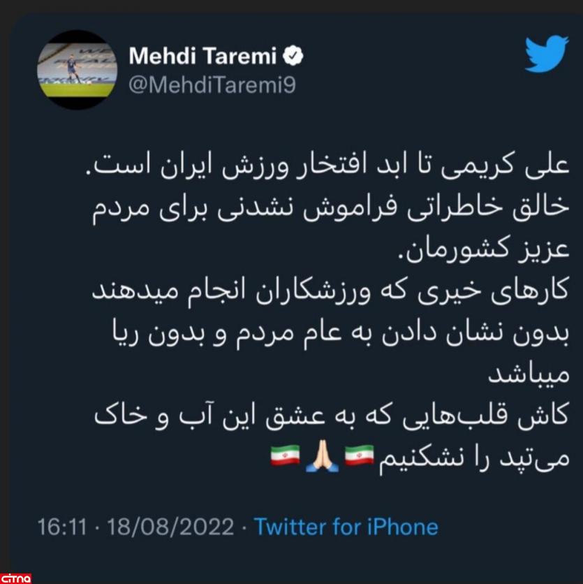 طارمی در صفحه توییتر خود نوشت: علی کریمی تا ابد افتخار ورزش ایران است. خالق خاطراتی فراموش نشدنی برای مردم عزیز کشورمان.