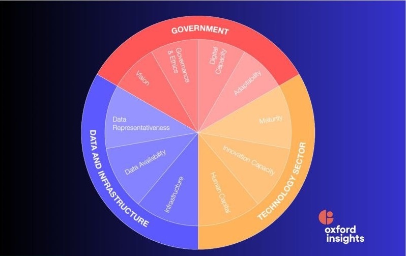 گزارش آکسفورد اینسایت مبین این موضوع است که رتبه ایران در سال ۲۰۲۳ در شاخص آمادگی هوش مصنوعی، ۹۴ بوده است که متاسفانه ضعیف ترین رتبه ایران در این شاخص مربوط به رکن دولت بوده که امتیاز آن ۳۱/۵۶ ثبت شده است این موضوع نشان گر این نکته است که توجه به ژئواکونومی اقتصاد دیجیتال می بایست به جد مورد توجه دولتمردان قرارگرفته و در غیر این صورت این موضوع می تواند به عنوان حلقه گم شده توسعه در کشور تا سالیان طولانی باقی بماند. شاخص هایی برای تشخیص آمادگی پذیرش هوش مصنوعی در کشورها وجود دارد. هرکدام از ارکان این شاخص دارای ابعاد متفاوتی هستند و سؤالات گوناگونی در این زمینه می تواند مطرح گردد. دولت به عنوان رکن اول، زیرساخت و اطلاعات به عنوان رکن دوم و بخش تکنولوژی به عنوان رکن سوم، سه رکن اصلی این ارزیابی ها می باشند.
