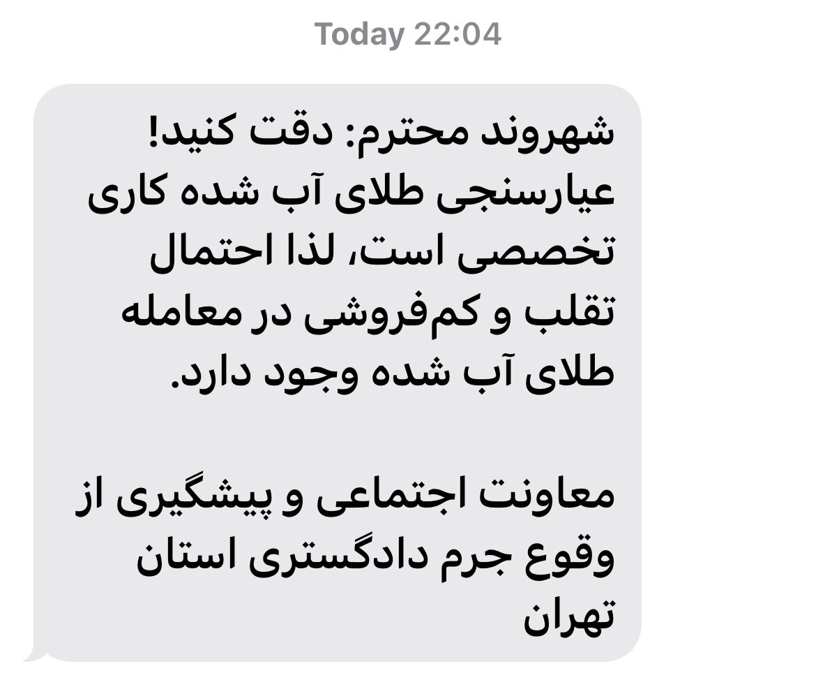 معاونت اجتماعی و پیشگیری از وقوع جرم دادگستری استان تهران در پیامکی اعلام کرد که عیارسنجی طلای آب شده کاری تخصصی است، لذا احتمال تقلب و کمفروشی در معامله طلای آب شده وجود دارد.