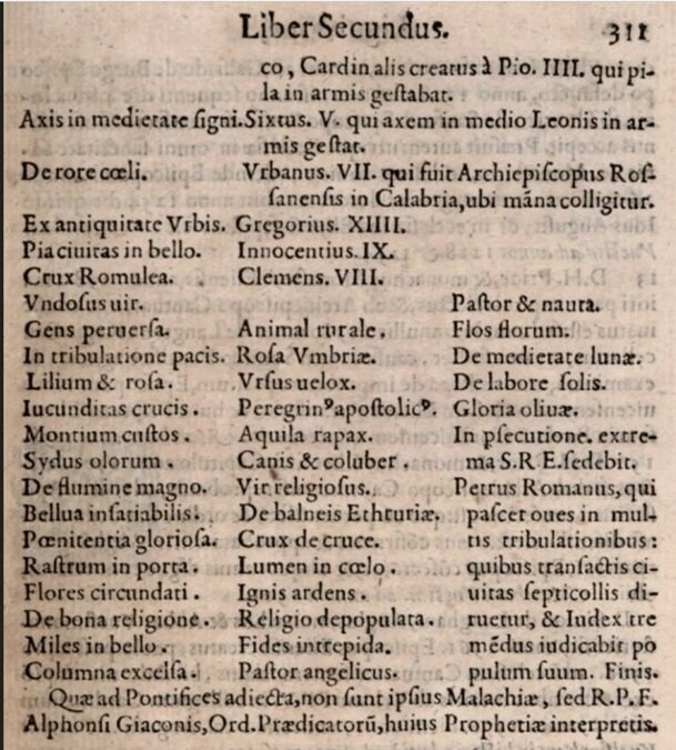 این کتاب شامل ۱۱۲ بخش رمزآلود به زبان لاتین است که ادعا میشود آینده پاپهای کاتولیک را از سلستین دوم تا رهبر کنونی کلیسا پیشبینی کرده است.