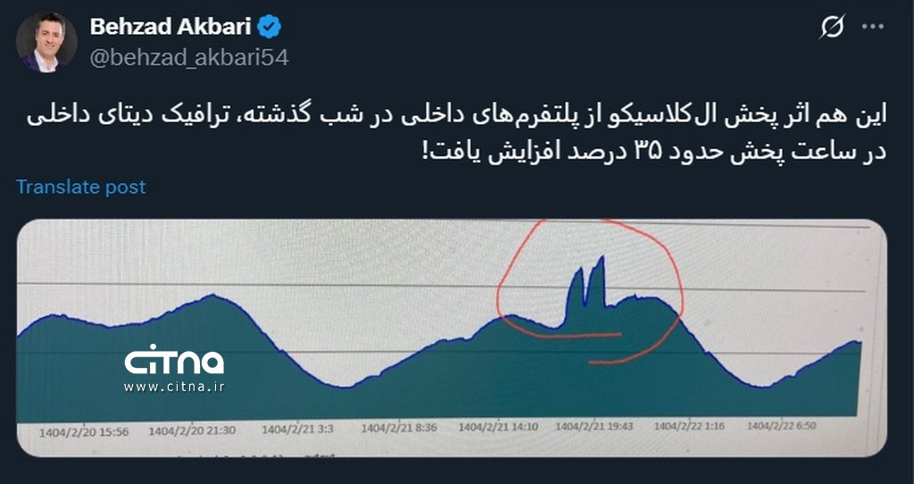 این هم اثر پخش الکلاسیکو از پلتفرمهای داخلی در شب گذشته، ترافیک دیتای داخلی در ساعت پخش حدود ۳۵ درصد افزایش یافت!