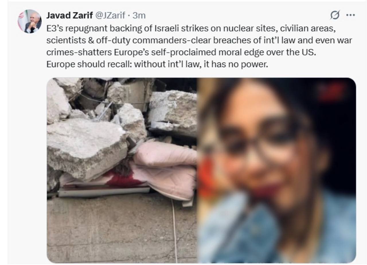 به گزارش سرویس وبگردی سیتنا، محمدجواد ظریف وزیرخارجه اسبق کشورمان در شبکه ایکس نوشت: حمایت مشمئز کننده انگلیس، فرانسه و آلمان از حملات اسرائیل علیه تأسیسات هستهای، مناطق غیرنظامی، دانشمندان و فرماندهان (در زمان استراحت) که همگی نقض مسلم حقوق بینالملل و حتی جنایت جنگی محسوب میشوند، ادعای برتری اخلاقی اروپا حتی در برابر آمریکا را نابود میکند.